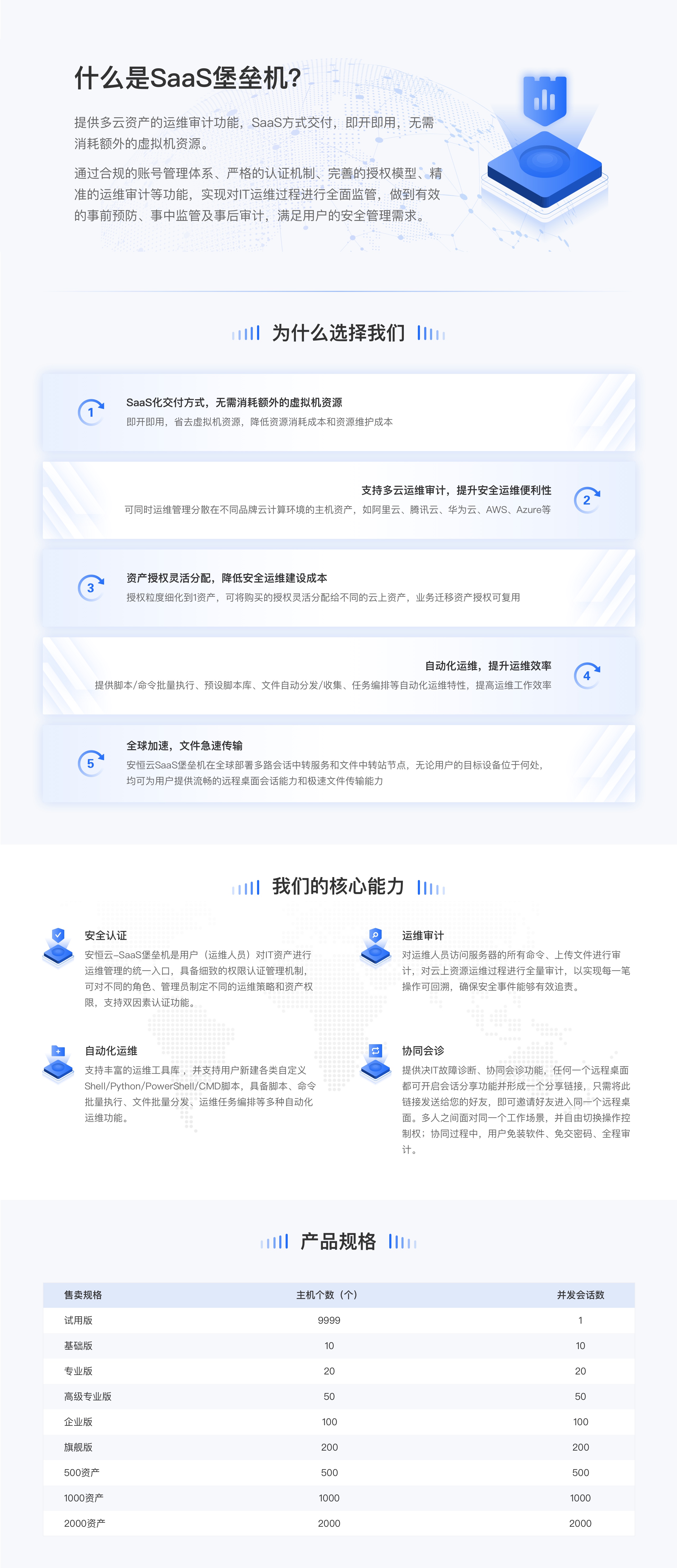 提供多云资产的运维审计功能,通过合规的账号管理体系、严格的认证机制、完善的授权模型、精准的运维审计等功能,实现对IT运维过程进行全面监管,做到有效的事前预防、事中监管及事后审计,满足用户的安全管理需求。