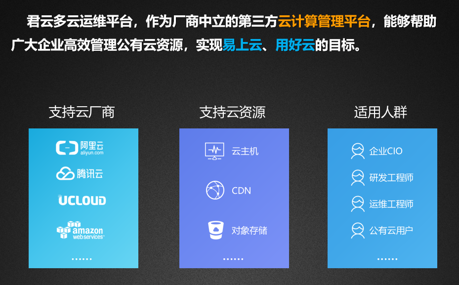 针对云资源得管理,包含主机、网络、存储、安全等云资源基础设施,以及后期的技术运维,业务稳定,高效,针对信息系统资源的安全和维护,企业需要投入大量的人力物理以完成主机监控、数据备份、运维审计,性能优化等,君云运维管理平台为您提供一站式解决方案,全方位满足您对云时代的产品和技术的全部需求。