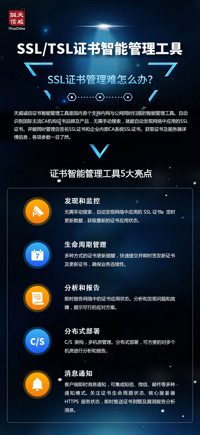 天威诚信证书智能管理工具是国内首个支持内网与公网同时扫描的智能管理工具。 自动识别国际主流CA机构证书品牌及产品,无需手动搜索,就能自动发现网络中应用的SSL证书。 并能同时管理自签名SSL证书和企业内部CA系统SSL证书。获取证书及服务器详情信息,各项参数一目了然。