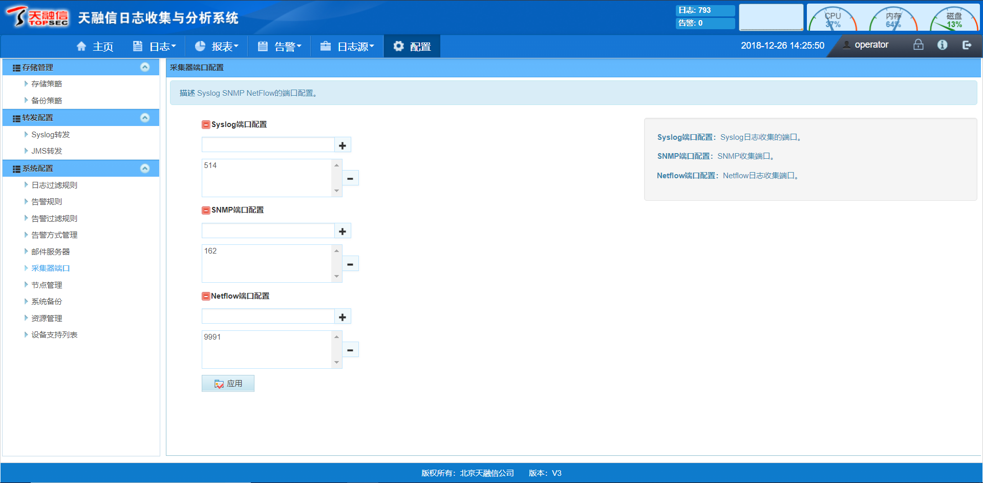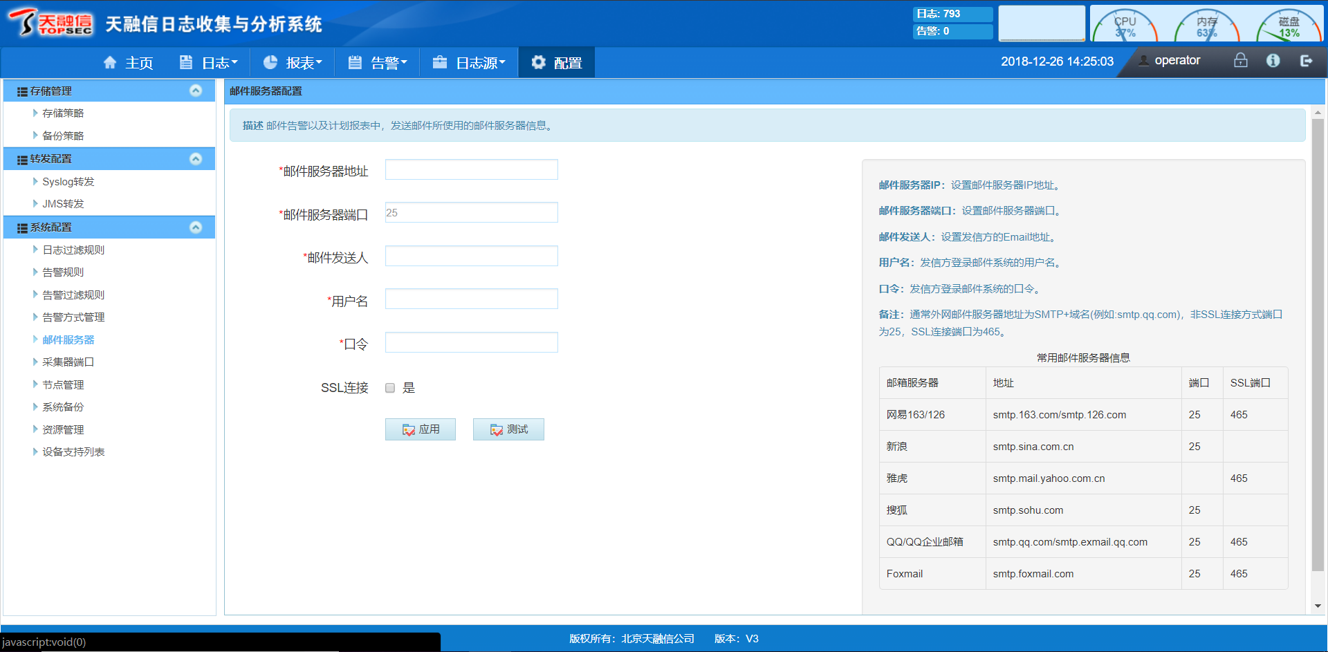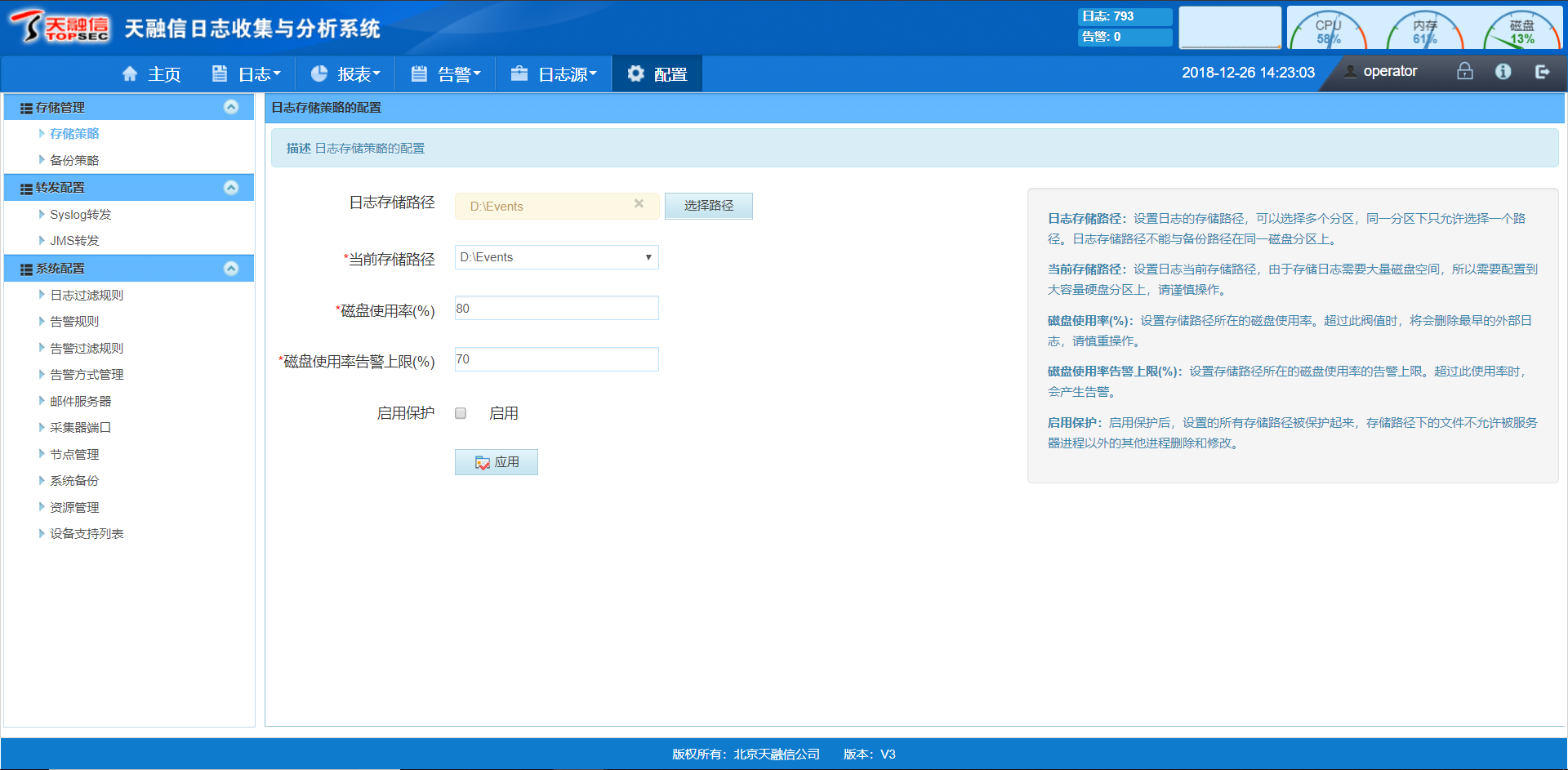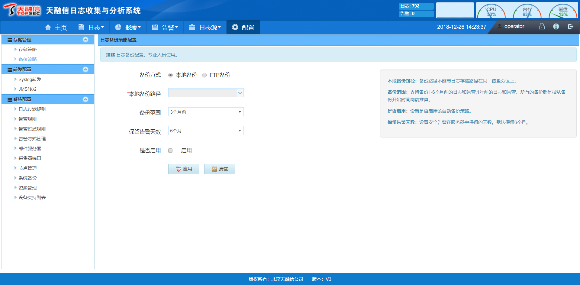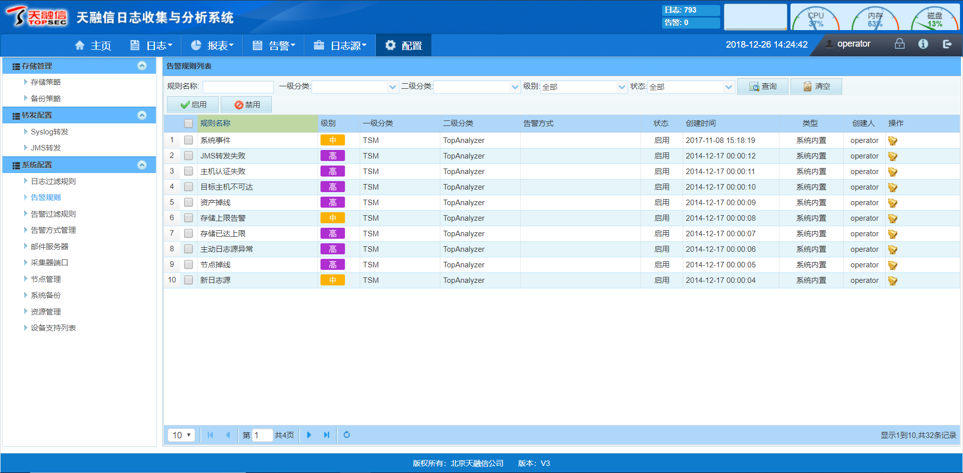天融信日志收集与分析系统可以实时监视系统运行状态,包括CPU、内存和磁盘空间使用率以及当前平均日志流量,方便管理员及时了解系统运行和负载情况,并能根据策略及时发出告警。